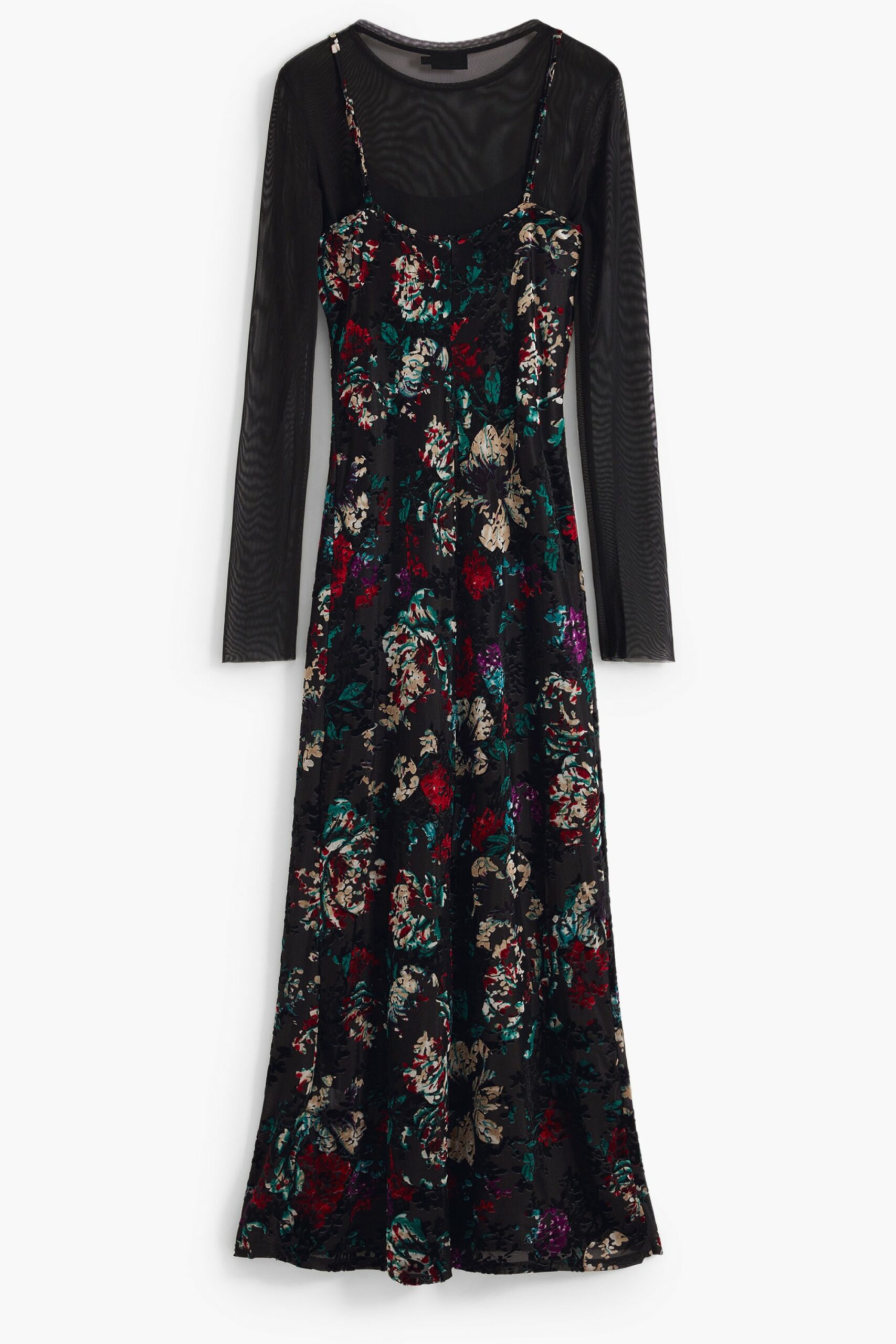 LONG PATTERNED DRESS, CASSIDY, THIN STRAPS, CREW NECK, DETACHABLE LONG-SLEEVED SLIP, CONTRASTING DETAILS, LOGO